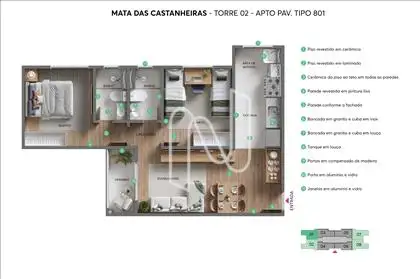 Apartamento composto por: Sala, 02 quartos, 01 varanda, banheiro social, cozinha e área de serviço, piso laminado nas áreas íntimas, e de porcelanato nas áreas frias, Piso Cozinha com bancada em granito e cuba em inox Banheiro com bancada em granito e cuba em louça Área de serviço com tanque em louça .